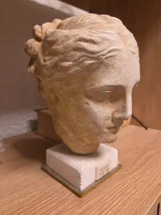 Questa è una replica di una testa greca, realizzata in pietra. Design classico. Tonalità beige e marroni.