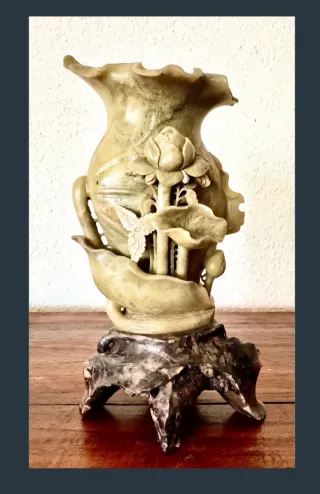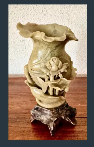 Bello vaso, violaceo intagliato in pietra o roccia di sapone (Statuetta), realizzato artigianalmente a Tokyo (Giappone) negli anni '70/'80, finemente intagliato con motivi floreali, si noti il suo impeccabile stato di conservazione e la buona fattura del pezzo. 20,5 cm di altezza. VISITA IL MIO PROFILO, ALTRE COSE DI QUESTO STILE