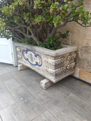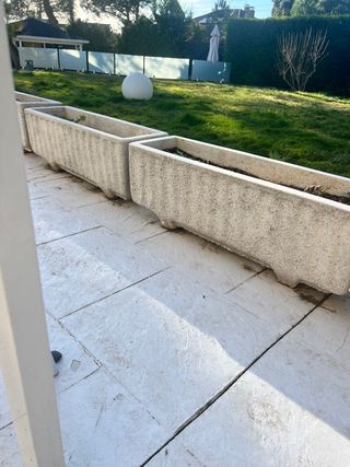 Set di due fioriere in pietra con design allungato e piedi. Materiale in pietra resistente. Tonalità beige e grigio che si combinano facilmente. Ideali per dare un tocco decorativo a esterni o interni. Il prezzo è di 30€ ciascuna.