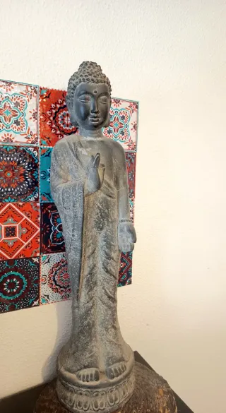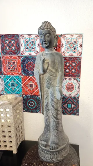 Statua decorativa vintage di Buddha di Maisons du Monde. Un pezzo che porta serenità e stile in qualsiasi spazio. Design dettagliato. Base ornamentale. Misura 80 cm di altezza. La testa è attaccata perché si è rotta durante un trasloco. Ma è perfetta. Di Maisons du Monde.
