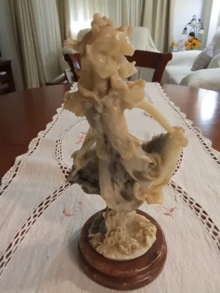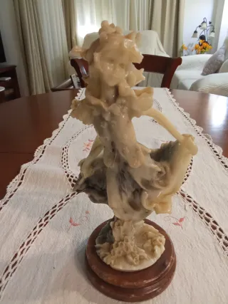 Elegante figura di una ballerina in movimento. Base di legno lucidato. Dettaglio floreale sulla base.