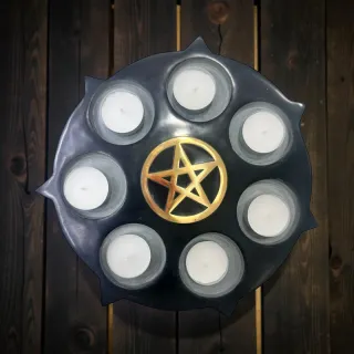 Elegante portacandele in pietra ollare nera, decorato con un pentacolo dorato al centro. Perfetto per creare un'atmosfera suggestiva. - Design a forma di ruota con 8 alloggiamenti per candele. - Dettaglio centrale con simbolo pentacolo. Materiale: Pietra ollare Misura: cm 25 Peso totale: g 2254 Paese di Origine: India