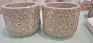 Set di vasi con un design elegante e moderno. Confezione da 4 unità a 18€. Finitura in pietra con dettagli in pan di oro. Texture in rilievo. Ideali per aggiungere un tocco decorativo.