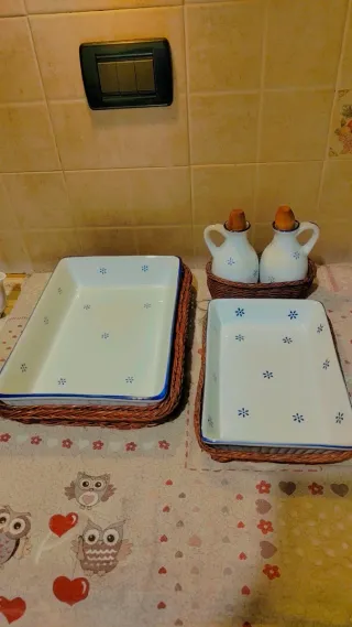 Set di pirofile in ceramica con decoro floreale blu, complete di cestini in vimini intrecciato. - Pirofile rettangolari con bordi rialzati. - Due bottigliette in ceramica con tappo in sughero, perfette per olio o aceto, alloggiate in un cestino. - Cestino più grande che contiene le bottigliette e una pirofila più piccola.