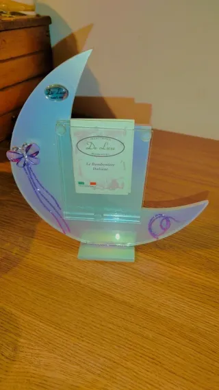 Deliziosa bomboniera a forma di mezza luna, perfetta per un'occasione speciale. Nuova, mai utilizzata. - Design a forma di mezza luna. - Decorazioni scintillanti. - Include un'etichetta De Luxe Bomboniera.