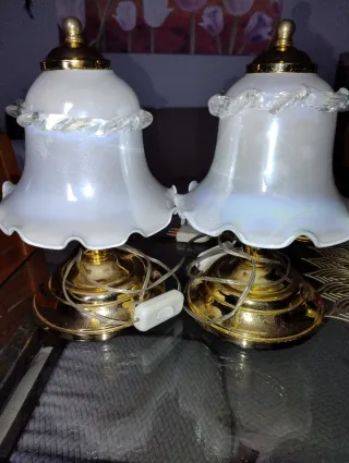 Elegante coppia di abat-jour con base in metallo dorato e paralumi in vetro bianco. Perfette per aggiungere un tocco di classe a qualsiasi ambiente. - Design classico e raffinato. - Dettagli decorativi sul bordo del paralume. - Interruttore sul cavo per un facile utilizzo. Una delle due è leggermente graffiata, vedi terza foto