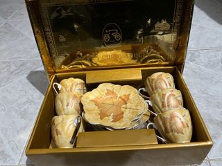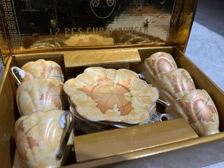 Elegante servizio da caffè composto da 12 pezzi, perfetto per ogni occasione. Il design è ispirato alle foglie, con dettagli raffinati. Cup & Saucer dipinti a mano - 6 tazzine e 6 piattini - Motivo a toglie autunnali - Colore oro e giallo - Confezione originale dipinti a mano Mai utilizzato