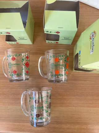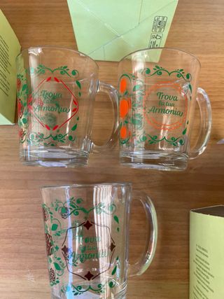 3 Tazze Armonia Mulino Bianco in vetro decorato da collezione adatte per tisane ecc.. 3 colori diversi assortiti Nuove! Nella loro confezione originale ( estratte solo per scattare le foto) vendono anche singolarmente 5€ (prezzo non trattabile)