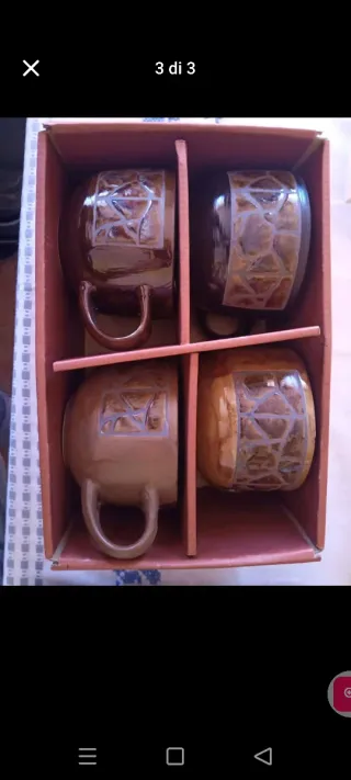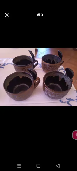 Set di 4 tazze per consommé, perfette per servire zuppe o brodo. Decorazione stile africano con cucchiaio e particolare foro nel manico della tazza come sede del cucchiaio Quattro tonalità differenti di marrone dipinte. Regalo raffinato e mai utilizzato, ancora nella scatola Vendo a Mesenzana o porto in zone limitrofe