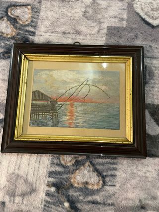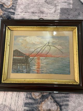 Quadro raffigurante un traboccò al tramonto, completo di cornice. - Cornice in legno scuro. - Passepartout dorato. - Vetro protettivo. Quadro di un trabocco al tramonto firmato dall’autore venduto con cornice 33x27 in legno e vetro Ben tenuto