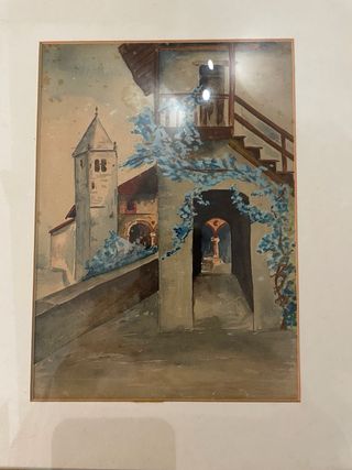 Dipinto raffigurante un paesaggio con una cornice. - Cornice in legno. - Vetro protettivo. Quadro di scena di paese con cornice dorata 37x30 e vetro Qualche macchia sulla tela interna ma ben tenuto
