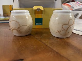 Elegante set di sale e pepe Thun in ceramica, con un design delicato e raffinato. - Decorazione floreale dipinta a mano. - Tonalità beige e bianche che si adattano a ogni tavola.