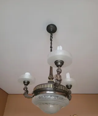 Elegante lampadario d'antiquariato (primi '900) inbronzoevetro opalinosatinato. Struttura finemente lavorata con decorazioni figurative (putti) sui bracci e coppa centrale decorata a rilievo. Dimensioni: Altezza totale:100 cm Larghezza totale (ingombro):66 cm Diametro coppa centrale:30 cm Sporgenza bracci decorati:18 cm (ciascuno) Condizioni:Ottimo stato conservativo, patina originale dell'epoca. Vetri integri.