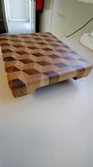 Bellissimo tagliere con un design a effetto 3D. - Realizzato in legno di noce, ciliegio e acero. - Motivo geometrico a cubi. - Bordi arrotondati.