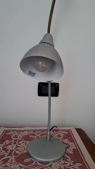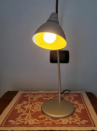 Lampada abat-jour grigia con luce calda. Inclinazione regolabile. Ideale per comodino o scrivania.
