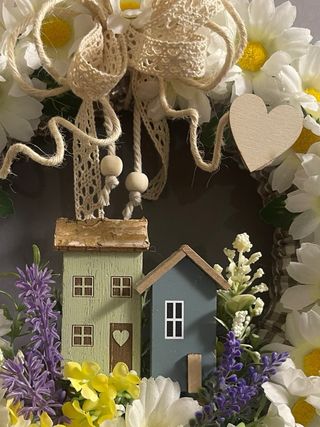 Deliziosa ghirlanda decorativa, perfetta per aggiungere un tocco primaverile alla tua casa. - Decorata con fiori gialli e bianchi. - Include un simpatico ape in legno con cappello. - Fiocco in tessuto bianco e beige. - Base in materiale grezzo.