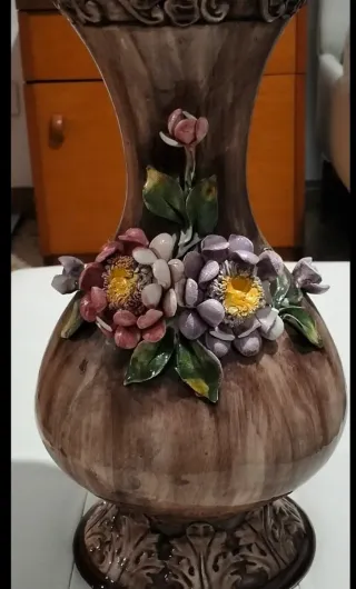 Elegante vaso vintage con decorazioni floreali tridimensionali. - Finitura marrone con sfumature. - Dettagli floreali multicolore. - Base decorata. Ceramica di Bassano.