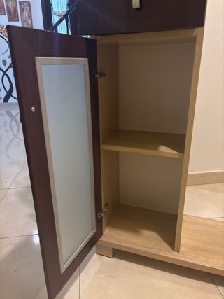 Mobile per ingresso. Combina legno e vetro. Finitura in tonalità marroni.