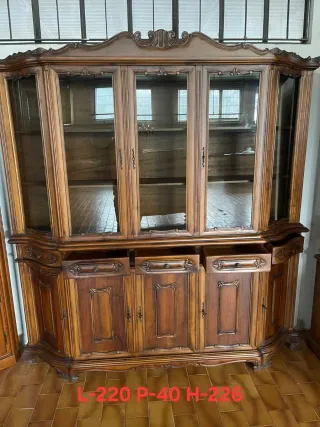 Mobile da soggiorno in legno con un design classico ed elegante. Porte in legno con dettagli intagliati. Vetrine in vetro per esporre oggetti. Ampio spazio di archiviazione con cassetti e scomparti.