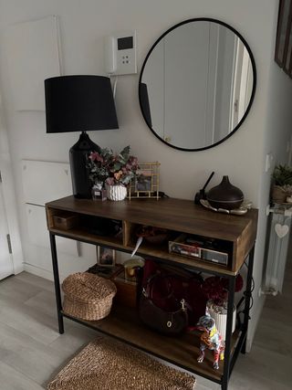 Bellissimo ingresso o consolle in stile industriale, perfetto per qualsiasi spazio. È composto da una mensola in legno e una barra di design in tubo metallico. Acquistato alla Maison du Monde a Malaga. - Ideale per posizionare oggetti decorativi - Design industriale e funzionale. - Struttura robusta e resistente.