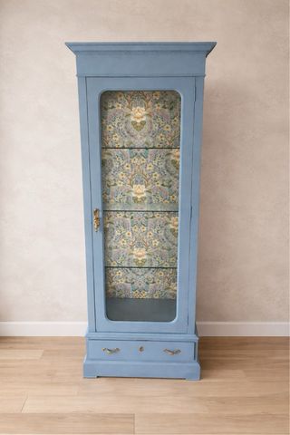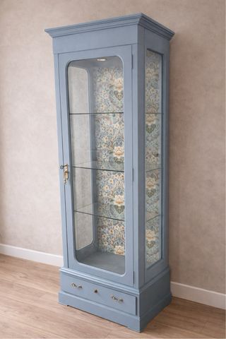 Elegantissima vetrina antica con design classico e finitura blu. Porta in vetro per esporre oggetti. Dettaglio di carta da parati floreale all'interno. Cassetto inferiore con maniglie dorate. Vetrine, credenze, mobili in legno, mobili antichi, Maison du Monde, Zara Home, vintage, vetrine in vetro. Larghezza 73 cm, profondità 45 cm, altezza 200 cm. Possibilità di trasporto se vicino alla mia zona. Se più lontano di 20 km, 25 euro all'ora. Museo, antico, legno massello.