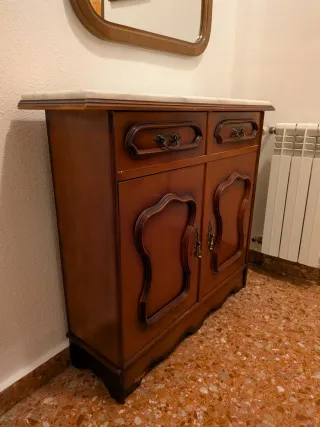 Elegante mobile d'ingresso con un design vintage. Combina la calda tonalità del legno con la sofisticatezza del marmo. Le misure sono indicate nelle foto. - Finitura in legno marrone. - Piano in marmo. - Due cassetti superiori con maniglie ornate. - Due porte inferiori con dettagli curvi e maniglie abbinate.