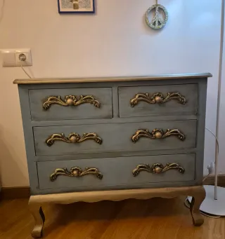 Mobile in stile classico con finitura a due tonalità che conferisce un tocco elegante. I suoi manici dorati aggiungono un dettaglio distintivo. Design a quattro cassetti. Gambe curve con finitura dorata.