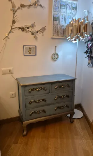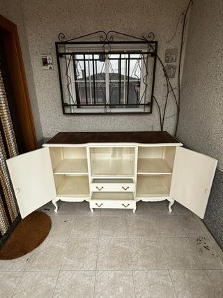 Aparador vintage e bianco con ampio spazio per l'archiviazione. Se ti interessano altri mobili dal mio profilo faremo sconti. Prezzo originale 300€. - Finitura rustica e usurata. - Quattro cassetti con maniglie integrate. - Porte laterali ribaltabili con sistema di apertura a pressione.