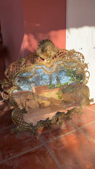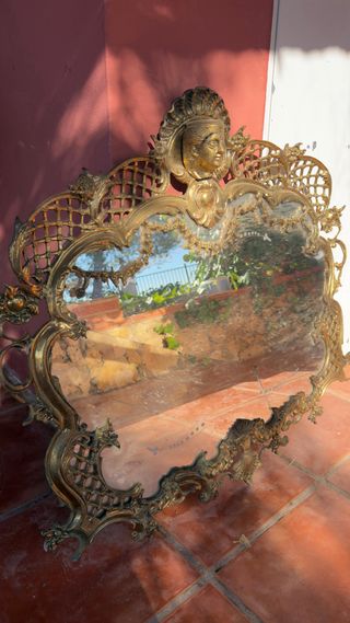 Elegante specchio vintage con un intricato telaio in stile barocco/rococò. Il suo design dettagliato e il finiture dorate aggiungono un tocco di distinzione. - Telaio ornato con motivi decorativi. - Forma curva e asimmetrica. - Ideale per aggiungere un tocco classico a qualsiasi spazio. Telaio per specchio vintage in stile barocco/rococò in metallo dorato (non plastica). È un pezzo solido e molto decorativo, con rilievi e figure classiche nella parte superiore. Lo specchio è rotto e con usura, ecco perché il prezzo. Perfetto per restaurare o usare solo il telaio come pezzo decorativo. Ideale per case di campagna, progetti di interior design, vetrine o decorazioni.