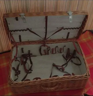 Elegante cesta da picnic in stile vintage, perfetta per le tue uscite in campagna o giornate in spiaggia. Il suo design classico e i materiali di qualità la rendono un accessorio indispensabile. Ideale per auto d'epoca. Misure: 60×39 cm. Con maniglia resistente e chiusure di sicurezza metalliche. Contiene due ceste, anche se una è visibile solo dall'interno. Una cesta è leggermente storta come si vede nell'immagine, ma può essere perfettamente raddrizzata. Le fibbie interne sono in pelle. Ideale per sessioni fotografiche, scenari di ogni tipo e vetrine. Aggiunge un tocco decorato e magico. L'interno è plastificata per una migliore pulizia.
