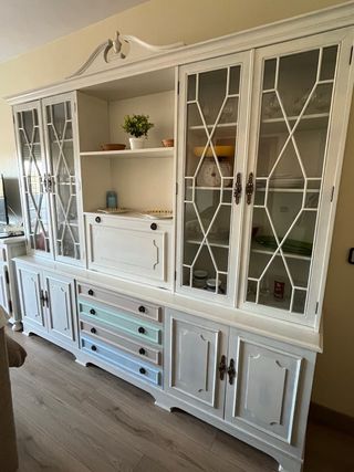 Vendo espectacular mueble de salón de gran formato con un diseño clásico renovado. Es una pieza muy versátil y con gran capacidad de almacenaje, ideal para dar personalidad a un salón o comedor. Medidas: 245 cm de largo x 190 cm de alto. Se divide en 3 módulos independientes, lo que facilita enormemente el transporte y permite moverlo con seguridad. 2 amplias vitrinas con cristales decorativos y estantes para vajilla/cristalería. Zona central con estantería abierta y secreter con puerta abatible (perfecto como minibar). Condiciones de venta: Recogida y desmontaje: El comprador debe encargarse de venir a por él y desmontarlo