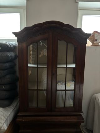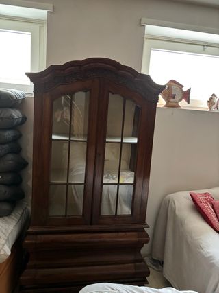 Elegante vetrinetta in legno scuro, perfetta per esporre oggetti da collezione o da servizio. - Ante superiori con pannelli in vetro decorati. - Ampio vano a ribalta. - Ante inferiori per maggiore spazio contenitivo. dimensioni: Altezza max. MT 2,20 Profondità max MT 0,50 Larghezza MAX MT 0,90