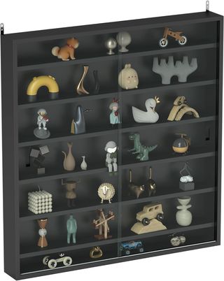 Vetrina espositiva a parete con 6 ripiani regolabili, vetrinetta per collezionismo, espositore a parete per oggetti da collezione, in vetro e truciolato, 80X9.5X83 cm, nero