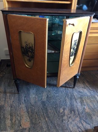 Mobile bar vintage anni ’50 in legno impiallacciato con ante decorate da vetri serigrafati raffiguranti scene romantiche in stile settecentesco. Interni specchiati con ripiani in vetro molato e supporti per bottiglie e bicchieri. Gambe in legno tornito nero, chiusura con serratura. Perfetto come mobile bar o vetrinetta da soggiorno. In ottime condizioni, con lievi segni del tempo. Dimensioni: 84x36x96(h) cm. Prezzo 290 € trattabili. Ritiro a mano in zona