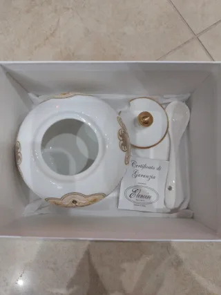 Elegante zuccheriera F.R.E.M con un design raffinato. - Realizzata in porcellana di alta qualità. - Decorazioni in oro e dettagli floreali. - Include un coperchio e un pratico cucchiaino.