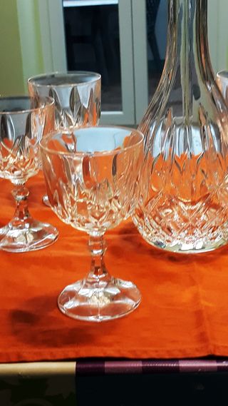 Servizio di cristallo molato design anno 70 composto da 1 bottiglia e una serie di 6 bicchieri di misura diversa come da foto in ottimo stato