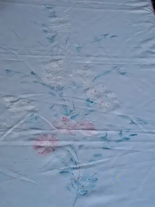 Tenda da tavolo con un delicato motivo floreale dipinto a mano. Aggiunge un tocco di colore e stile alla tua tavola. Misura 250 cm x 76 cm . Con bordo fatto all'uncinetto - Motivo floreale con fiori rosa e verdi. - Realizzata in tessuto di qualità.