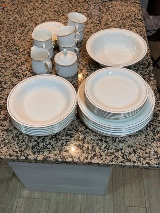 Elegante servizio di piatti e tazze in ceramica bianca con un raffinato bordo dorato. Ideale per ogni occasione. - Set completo di piatti piani, fondi e da dessert. - Tazze con piattini abbinati. - Zuccheriera e lattiera incluse. - Design classico e senza tempo.