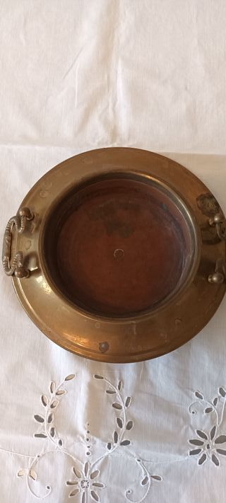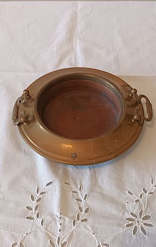Elegante braciere in metallo, con finiture in rame e ottone. - Design rotondo con due manici laterali. - Dettagli decorativi sui manici. - Dimensioni: Ø interno cm. 13 circa - Ø esterno cm. 21 circa - Peso grammi 248 Sono presenti alcune macchie di ossidazione.