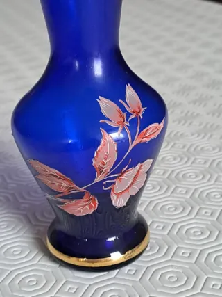 Elegante vasetto in vetro di colore blu intenso, con un raffinato bordo dorato. - Decorato con un motivo floreale stilizzato in tonalità rosa e arancio. - Base leggermente più scura con un motivo in rilievo.