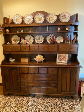 Elegante piattaia in legno con ripiani e cassetti, ideale per esporre oggetti decorativi. - Realizzata in legno robusto. - Decorata con piatti in porcellana colorata.