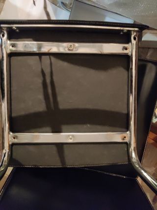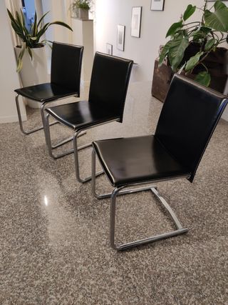 3 sedie moderne in pelle nera, cuciture a contrasto e gambe in metallo,molto solide e di buona qualità,marca Tonin casa ,in aggiunta c'è una quarta sedia che però necessità di essere sistemata