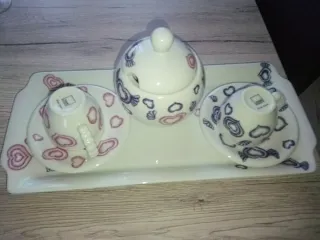 Thun linea True Love servizio composto da: 1 vassoio 1 zuccheriera 2 tazzine caffè 2 piattini. Mai usati, esposti in vetrina, no scatola. Come foto