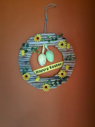 Decorazione pasquale fatta a mano, perfetta per dare un tocco di allegria alla tua casa. - Realizzata con elementi in tessuto e legno. - Raffigura un coniglietto con carota, fiori e uova fatti all uncinetto - Ideale per porte o pareti.