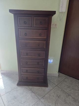 Set di mobili in legno scuro, composto da due comodini, un settimino e una cassettiera. Ideali per arredare la tua camera da letto con stile. - Due comodini con un cassetto ciascuno. - Un settimino con sette cassetti. - Una cassettiera con tre cassetti. - Maniglie in metallo finitura anticata.