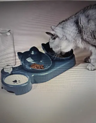 Set di ciotole per animali domestici, composto da tre pezzi. Il design a forma di gatto aggiunge un tocco giocoso. - Ciotola per cibo con due scomparti. - Ciotola per acqua con dispenser automatico. - Materiale resistente e facile da pulire.