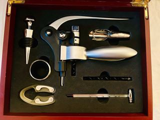 Set composto da n. 3 accessori da vino: - un versatore e un tappo versatore 2in1 - un salvagocce in acciaio e feltro - un termometro da 0° a 40° C Mai utilizzato, in perfette condizioni, nella sua custodia originale.