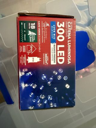 Catena luminosa per decorazioni natalizie, con 300 LED. - Cavo verde da 18 metri. - Altezza cavo 1,5mt. - Adatta per uso interno ed esterno (IP44). - Alimentatore incluso. - 7 giochi di luce con memoria dell'ultima selezione. - Luce fissa e 7 giochi di luce. - Luce blu e bianco freddo.