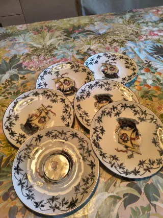 Set di piattini da dessert con un'elegante decorazione. - Design con nave d'epoca. - Bordatura decorativa in nero. - Realizzati in porcellana di alta qualità.