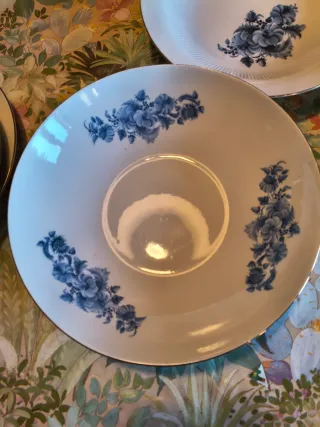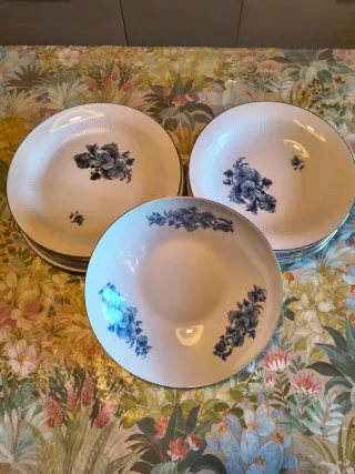 Elegante servizio da tavola in porcellana con un delicato decoro floreale blu. - Set di piatti con bordo rigato. - Motivo floreale blu su sfondo bianco. - 6 piatti piani 6 piatti fondi 1 insalatiera